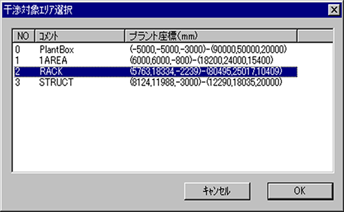 その後に、[ボックス選択]ボタンを押して、干渉対象領域を指定することが可能になります。(mroutで設定されている、クリップボックスのリスト一覧から選択可能です。)また、直接プラントボックス座標値を入力することもできます。