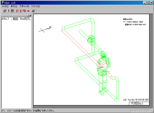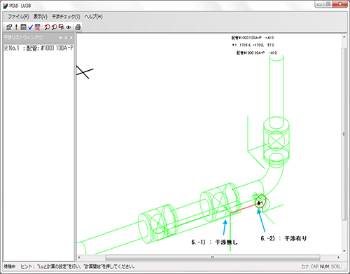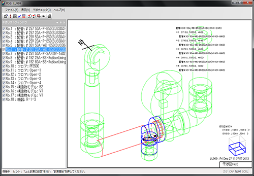 干渉箇所が赤または青(配管部品の断熱)で表示されます。