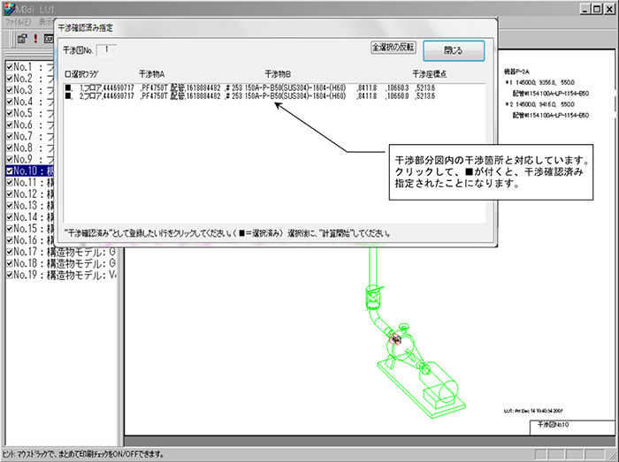 - 「干渉箇所確認済み指定」機能 検出された特定の干渉箇所を指定して、次回の干渉チェックから干渉部分図を生成しないことができます。