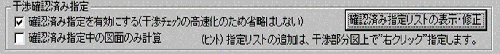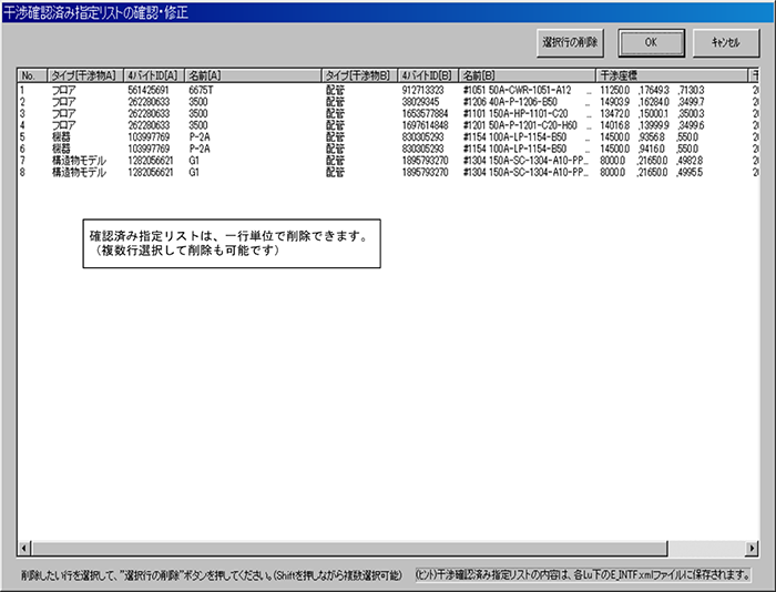 干渉部分図から特定の干渉箇所を指定し、以降の干渉チェックからは干渉部分図を生成しないようにする機能です。「確認済み指定リストボタンの表示・修正」で指定リストを表示、変更できます。