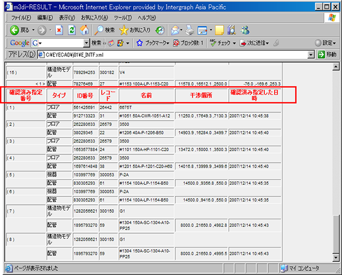 干渉物のレコード番号、名前、そして干渉場所(X,Y,Z座標)の情報をXML形式のFileに出力します。