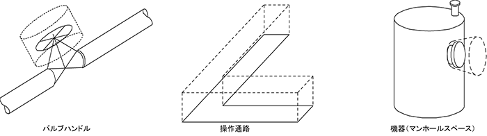 - 「バルブ操作スペース」、「マンホール手前のスペース」など、実際に物体は存在しないが、空間を確保するソフトボリュームという概念を導入しています。ソフトボリュームを使って干渉チェックを行うことで必要な空間が確保できているかを確認できます。