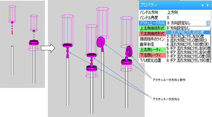 mroutのプロパティのアクチュエータ方向を0:方向設定なしから1:流れ方向に対し右90度 に変更することにより計器表示面を上面から側面へ首振りが可能。