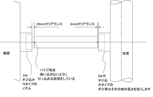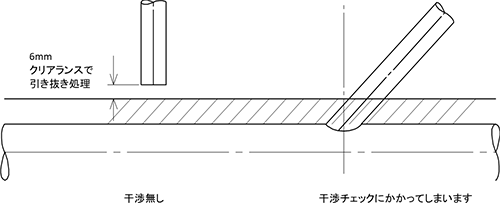 上図の場合はSWやネジ込みタイプのTee等やイモ付分岐部から分岐ラインがパイプやニップルで始まる場合ですが、下図のように分岐ラインの直進形状部品が直付で始まる場合も、干渉チェック用変換で引き抜くようにしています。