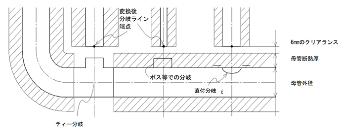 このような特別の処理をして、母管(とその断熱)と分岐ライン(とその断熱)どうしの干渉チェックにかからないようにします。