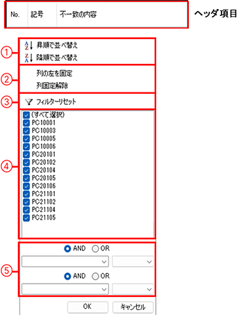 | ⑤条件絞り込みエリア | ④のフィルター対象一覧を利用して、AND/OR検索したり、判定条件を指定して絞り込みをすることができます。 |