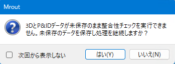 最初に以下の保存確認ダイアログが現れます。「次回から表示しない」にチェックをいれるとプログラム起動中はこのメッセージは現れません。 ただしMroutを一度終了して再度「整合性チェック」を実行すると再度このダイアログが現れます。