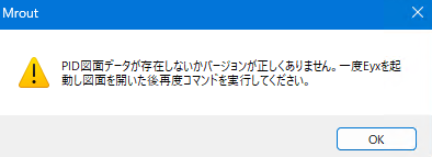 Mroutで整合性チェックを実行するとP&IDデータを取得するためEYEPID(eyx)を起動します。EYEPIDライセンスがなくても読み取り専用で起動します。 EYEPID(eyx)が他のLuで起動している場合は閉じてから再実行するようにメッセージが現れます。