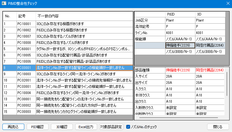 3Dとの整合性チェックを実行し結果を「P&ID整合性チェック」ダイアログに表示します。