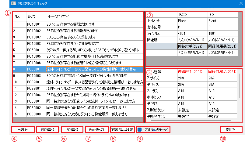 | ③部品比較リスト | 不一致詳細比較リストを選択したときの部品の詳細をP&IDと3Dを比較表示します。不一致詳細、部品比較リストを参照 |