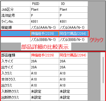 不一致一覧リストを選択すると、不一致詳細比較リストにP&IDと3Dの比較リストを表示し、さらに部品を選択すると下のウィンドウに部品比較リストに部品の詳細情報を並べて表示します。