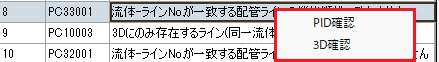 リスト上でマウスを右クリックすると以下のメニューが表示されます。「PID確認」で対象のP&IDモデルにズームし、「3D確認」で3Dモデルにズームします。対応するモデルがない場合はボタンは無効となります
