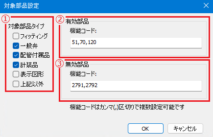 P&IDとの整合性チェック対象としない3D部品の機能コードを設定します。カンマ(,)区切りで複数設定が可能です。 対象部品タイプで設定していてもここで設定された機能コードは整合性チェック対象外となります。ただし有効部品に同じ機能コードが設定されていると整合性チェック対象となります。 |