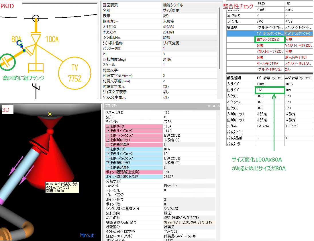 3Dでは配管付属品、計装品は入/出サイズそれぞれ別の設定ができますが、P&IDでは原則1つの部品に対して入出別サイズの設定はできません。レジューサなどの一部の機能シンボルは設定可能です。 整合性チェックの場合部品の比較で入/出サイズが異なる部品は常に不一致となってしまうため、P&IDで「サイズ変化」タイプのシンボルを入れると整合性チェック時の部品サイズはそのサイズ変化が反映されます。 レジューサは「サイズ変化(実部品)」というタイプで「サイズ変化」タイプとは異なるので他の部品サイズには反映されません。「サイズ変化」タイプの両側に部品があると近い方の部品に反映します。