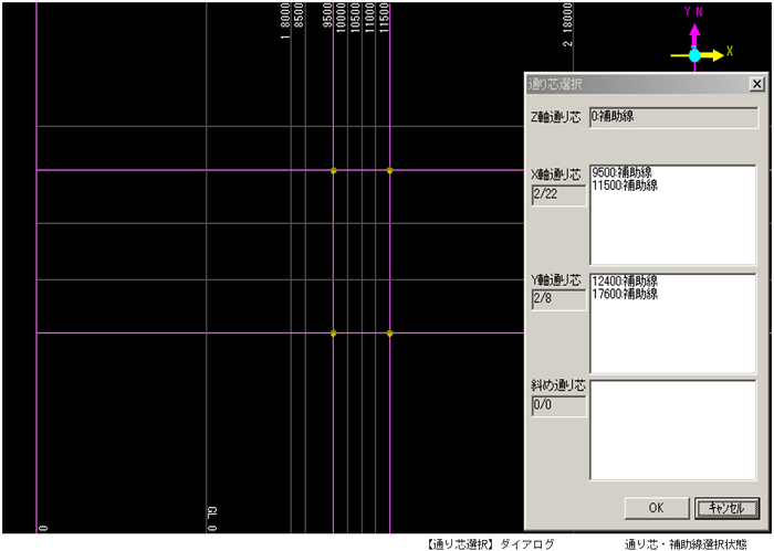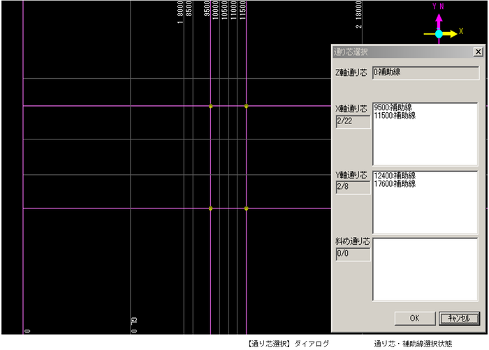 該当する補助線、通り芯をクリックすると、【通り芯選択】ダイアログに選択した座標値が表示されます。