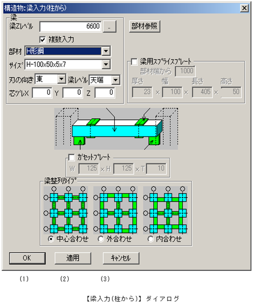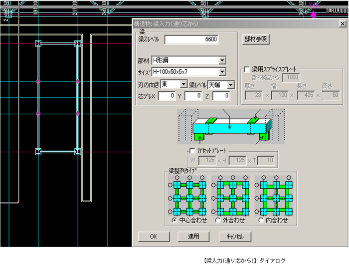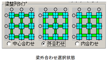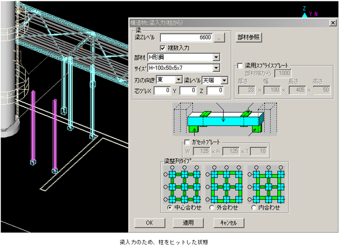 予め梁の取付け位置を芯ズレした状態で入力する場合、合わせ位置をチェックします。