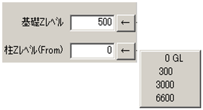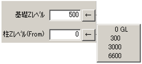 テキストボックス内にレベル座標値を入力、またはテキストボックス右の矢印ボタンをクリックします。予めZ座標の補助線、通り芯を入力しておくと、座標一覧が表示されます。該当座標値を選択すると、指定した座標値がテキストボックスに反映されます。