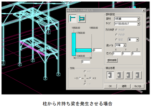 【片持ち梁入力】ダイアログで設定した内容をモデリングウィンドウ上で確認する場合、[適用]ボタンをクリックすると設定した
