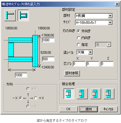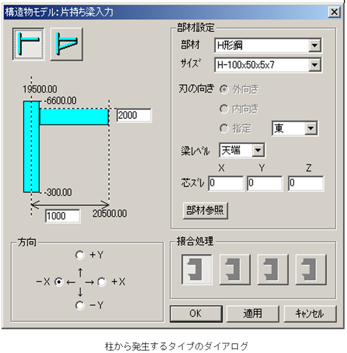 【片持ち梁入力】ダイアログは、柱から発生する場合と梁から発生する場合で、ダイアログ、片持ち梁の形状に違いがあります。