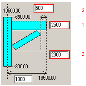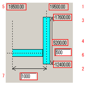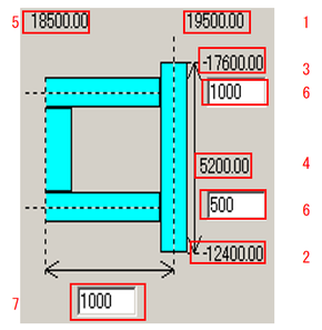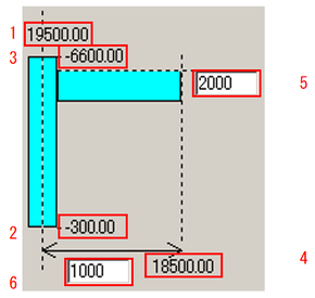 No. 説明 1 選択した梁のX座標(Y座標) 2 選択した梁の始点Y座標(始点X座標) 3 選択した梁の終点Y座標(終点X座標) 4 選択した梁の長さ 5 張出の末端X座標(Y座標) 6 片持ち梁の基準位置を始点Y(X)からの距離を入力します。(2点) 7 片持ち梁の長さを入力します。(実長を指定します。)
