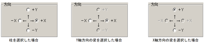 片持ち梁の張出方向を指示します。 梁の場合、選択した梁の方向を基準に2方向の選択となります。 柱の場合は、選択した柱を基準に4方向の選択が可能となります。 |
