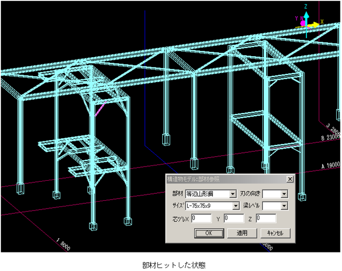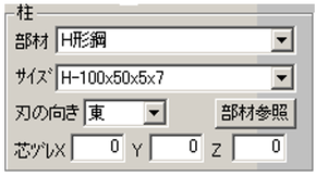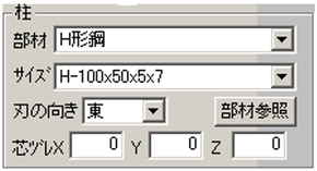 4 芯ヅレ 柱を芯ヅレにする場合、補助線、通り芯に対してのヅレ方向、ヅレ数値を設定します。 5 部材参照 既に入力済みの構造物データと同じ部材を指示する場合、[部材参照]ボタンをクリックした後、該当部材をクリックすると、ヒットした部材と同じ部材、サイズになります。