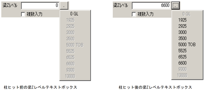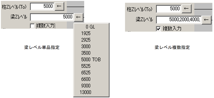 - 梁Zレベルテキストボックスは「複数入力」をチェックすると、複数Zレベル指定を行えるようになります。