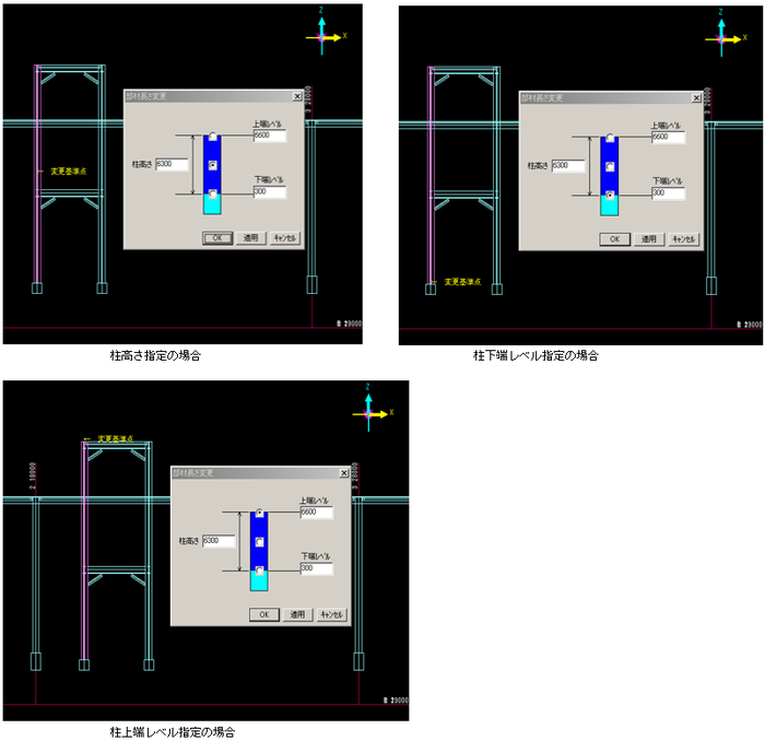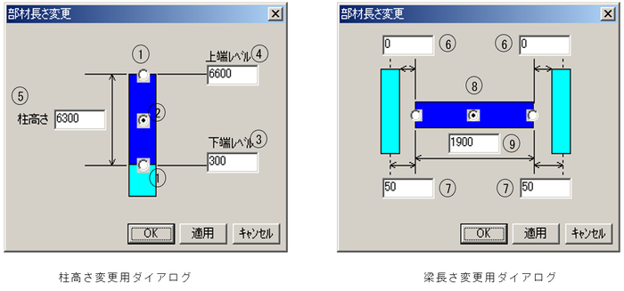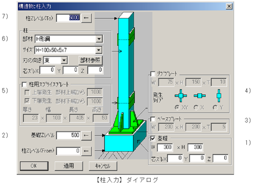 No. 説明 1 選択した柱のX座標 2 選択した柱の始点Z座標 3 選択した柱の終点Z座標 4 張出部分のX、Y座標(方向によりX、Y方向座標となります) 5 片持ち梁の基準Z座標を入力します。 6 片持ち梁の長さを入力します。(実長を指定します)