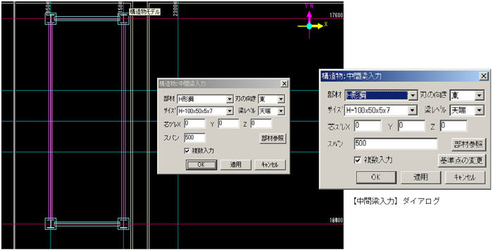 [<< 戻す]ボタンをクリックした後は、再び【柱・梁一括入力】ダイアログ上で設定する事が可能です。