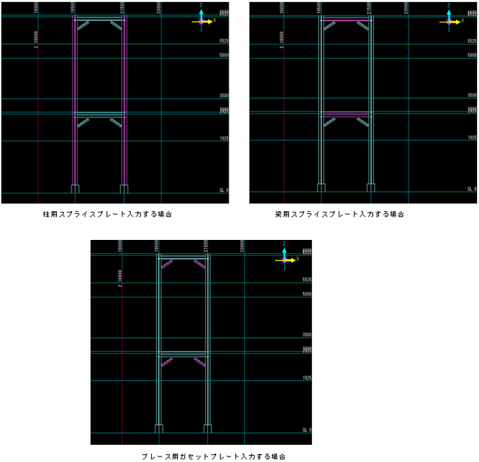 柱と梁の接合部分にガセットプレートを入力する場合、「ガセットプレート」にチェックを入れ、ガセットプレートのサイズを指定します。