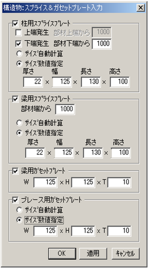 柱の接続部に取付けるスプライスプレートを入力する場合、「柱用スプライスプレート」にチェックを入れ、スプライスプレートのサイズと取付位置を指定します。