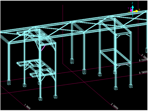 - 工場配置やプラントにおける、架構やラック等の構造物の三次元Dataを、グラフィックディスプレイ対話で作成します。