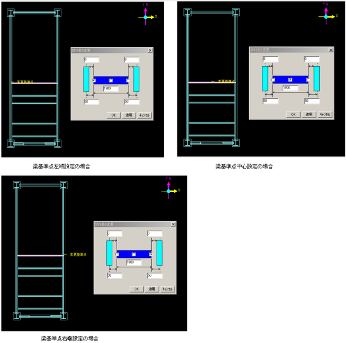 ダイアログに表示している選択した梁の各X、Y座標は、選択した梁の方向と連動していますので、選択した梁の方向によりダイアログの表示が可変します。