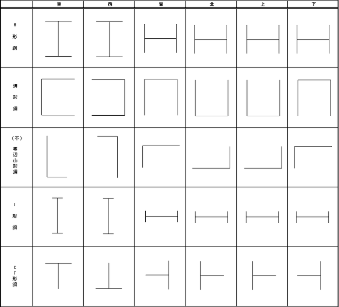 No. 部材種名 記号 1. I形 B.U 2. CT形 B.U 3. カバー補強H形 ※ 4. 十字柱 ※ 5. 山形 B.U 6. 2丁山形 ※ 7. みぞ形 B.U 8. 2丁みぞ形 ※ 9. 平鋼 10. 丸鋼 11. パイプ B.U 12. 角形管 B.U 13. つづり合わせCT形 B.U 14. H形 B.U ※これらの立体表示は角柱表示となります。