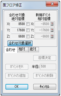 面フロア修正を行う場合、修正したいフロアを選択(一次選択)し、メニューバーより〔フロア(R)〕-〔面フロア修正〕を選択すると、以下のダイアログが表示され、修正したいフロアのポイント、またはエッジをクリック(二次選択)し、修正を行います。