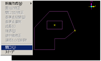 同一平面上にある2つのフロアを選択します。メニューバーより〔フロア(R)〕-〔開口(O)〕を選択、またはマウスの右クリックでポップアップメニューを表示し、〔開口入力〕を選択します。