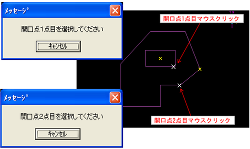 開口点1点目を選択してください”とメッセージダイアログが表示されます。開口するポイントをマウスでクリックするとポイントにマーカが表示され“開口点2点目を選択してください”と表示されます。