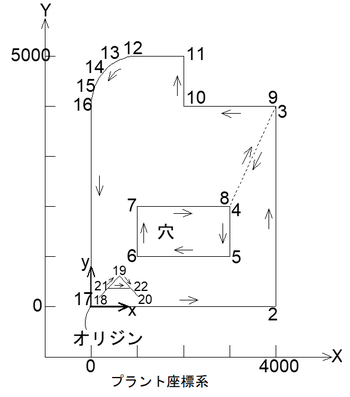 - 入力したプラント空間上のフロアコーナー点列は実数ですが、フロア定義座標系上のX、Y点列は整数(16ビットの)で記録しており理論上最大32,767(mm)です。