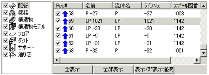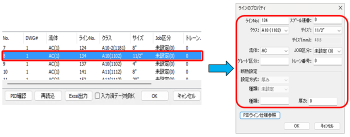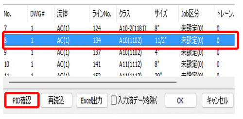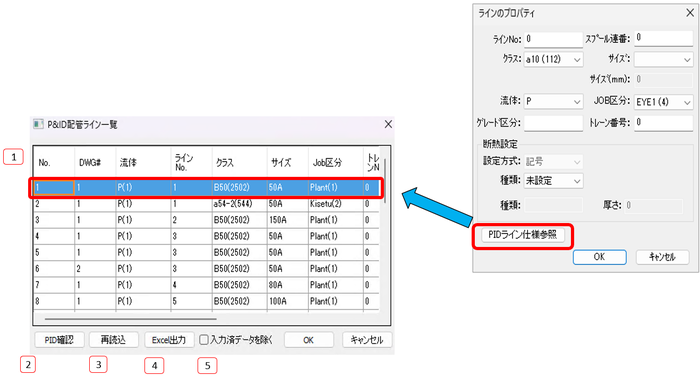 - 「PIDライン仕様参照」ボタンを押すと「P&ID配管ライン一覧」が表示されます。