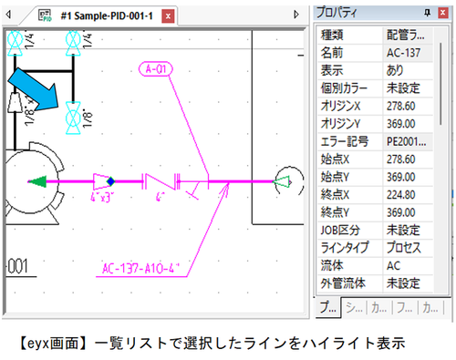 PID確認ボタンを押すと、選択しているラインが登録されている図面、およびそのラインをeyxで確認することができます。