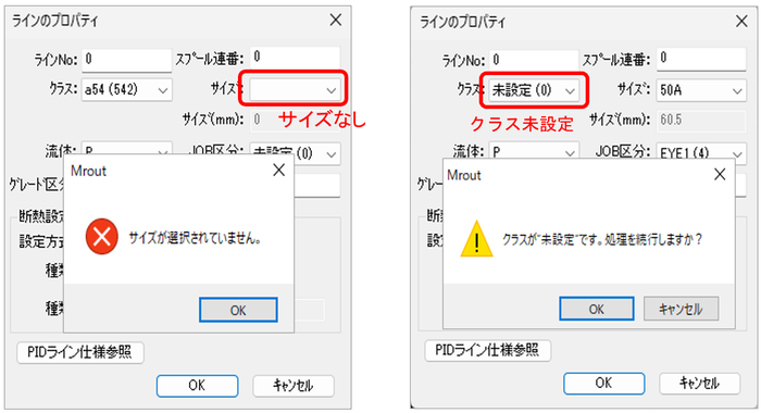 正しいサイズを選択してOKボタンおしてください。クラスが「未設定」の場合は「クラスが未設定です。処理を続行しますか?」が現れ、こちらはOKボタンで処理を続行可能です。