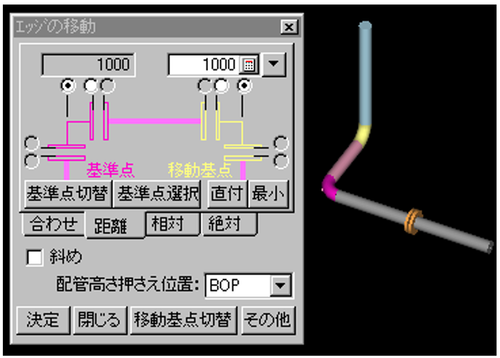 選択したエッジ(黄色の移動基点)をエルボ(ピンク色の基準点)に直付するといった操作が行えます。