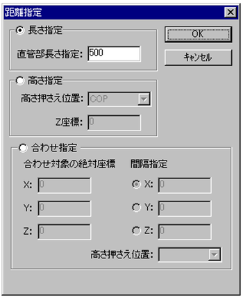 機器ノズルが上下方向に取付いていて、ラインをZ方向に延長する場合、高さ押え位置(BOP、COP等)、Z座標(絶対座標)を設定します。