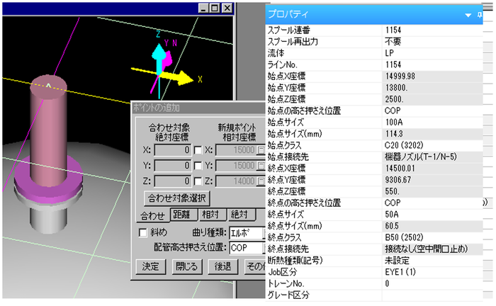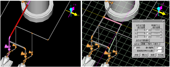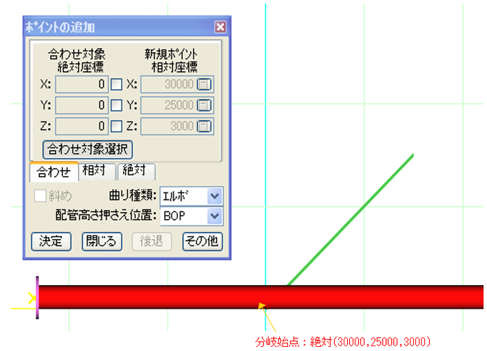 - 手順2で設定した「分岐後ポイント相対座標」まで配管が伸び、【ポイントの指定】Dialogとガイドプレーンが表示されます。
