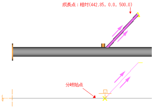 (成長点を決めます)この例では100A(外径114.3mm)なので相対で(x,y,z) = (442.85,0,500) とします。