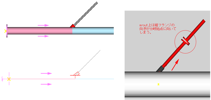 また分岐配管側のボスに一番近い部品(下図では組フランジ)の向きはmrout上では分岐始点に向いていますが、スプール図、組図では正しく表現されます。またカットパイプ長も(従来通り)正しく計算されます。