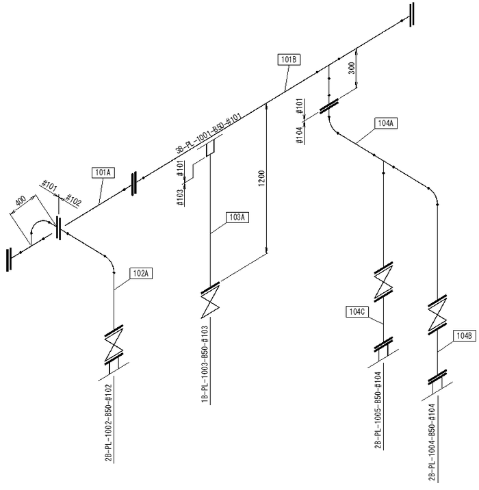 - 以下の事例の場合、PL-1001のスプールNo.は101であった時、そこから分岐したラインのフランジまでの間の距離が(SPISS=)1000mm以内でかつ、曲り部の数(MCISS=)1以内の時は母管側(PL-1001)のスプール図に入れる。