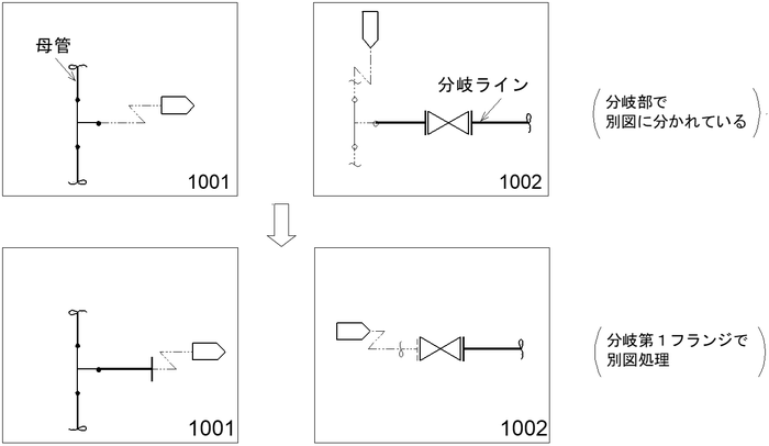 母管と分岐ラインが分岐部で別図に分かれているとき、条件をみて別図分割の位置をバッチ的に置き換えます。