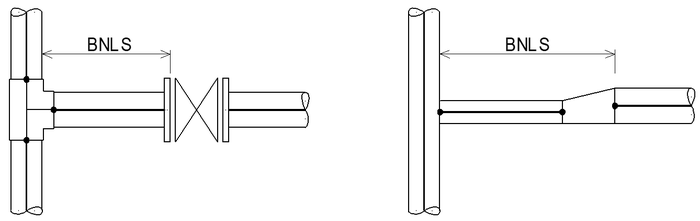 - 母管の表面から分岐ラインの第1シンボルまでを含む距離(BNLS)が、指定値以内の場合処理を行います。