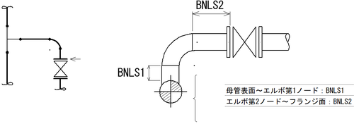 母管から分岐したラインの、最初のシンボルがエルボ(BW、SWタイプの90°、45°、カットエルボ)で、その次のシンボルがフランジの場合、バッチピース分割処理をする、しないを制御します。 BNLS1、BNLS2ともにBNL比較長以内の場合、バッチ処理を行います。 ![]() |